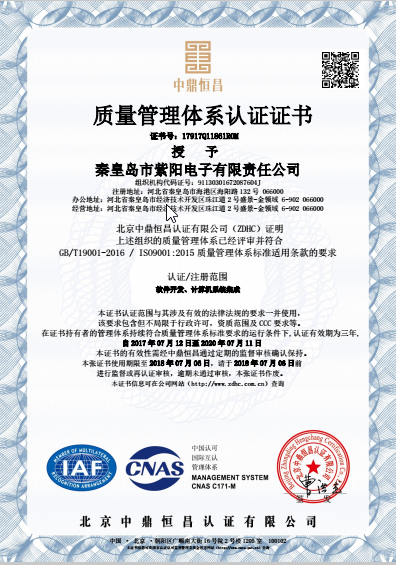 经过我公司指导,秦皇岛市紫阳电子有限责任公司顺利取得ISO9001质量管理体系认证证书。