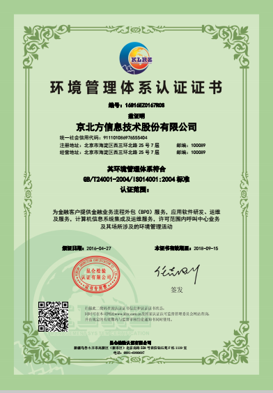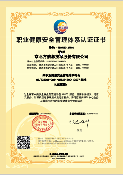 经过我公司指导,京北方信息技术股份有限公司顺利取得ISO14001环境管理体系、OHSAS18001职业健康安全管理体系认证证书。